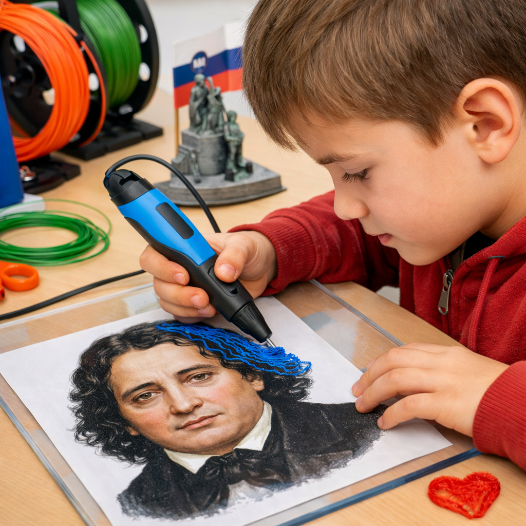 Delavnica je zasnovana sproščeno in je primerna tudi za popolne začetnike. Otroci lahko sledijo predlogi portreta Franceta Prešerna ali pa s 3D pisalom ustvarjajo po lastni domišljiji. Mlajši otroci naj bodo v spremstvu odraslih.