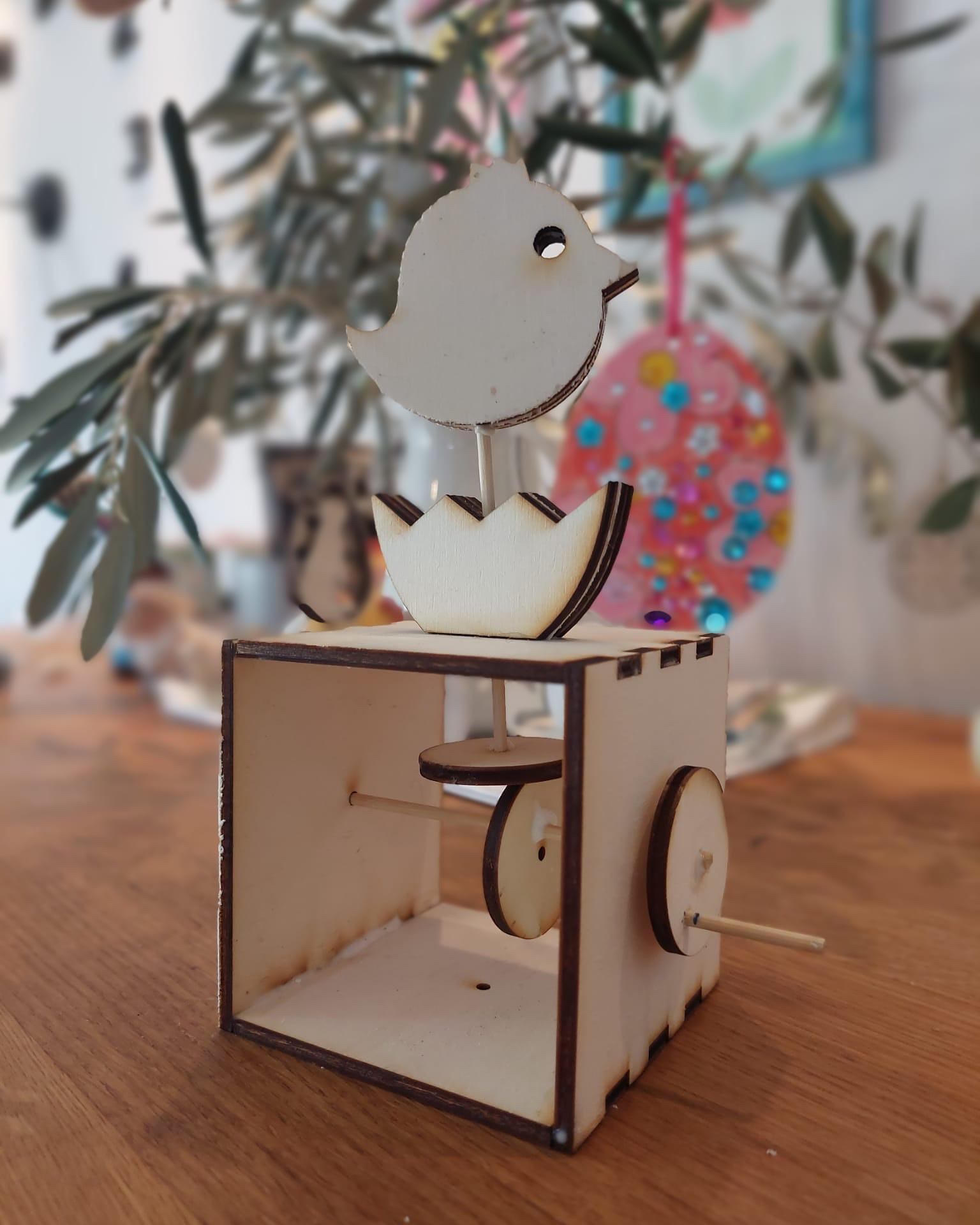 V naslednjem koraku izrezane dele sestavimo, povežemo in zlepimo v celoto ter ustvarimo simpatične plešoče piščančke. Ker delavnica poteka tik pred veliko nočjo, je tudi izdelek tematsko obarvan in praznično navdihnjen.